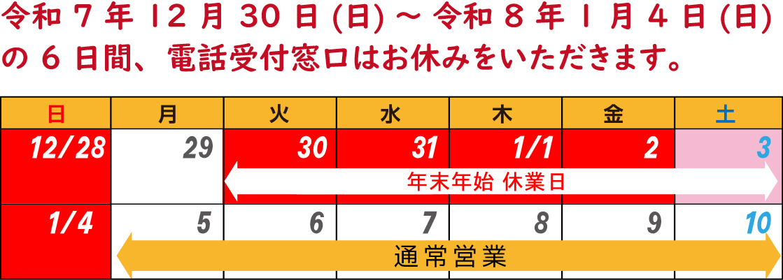 | 平素は格別のご愛顧をいただき誠に有り難うございます。 年末年始の休業について以下の通り、お知らせいたします。 ※休業期間中は、電話受付窓口はお休みをいただきます。 |