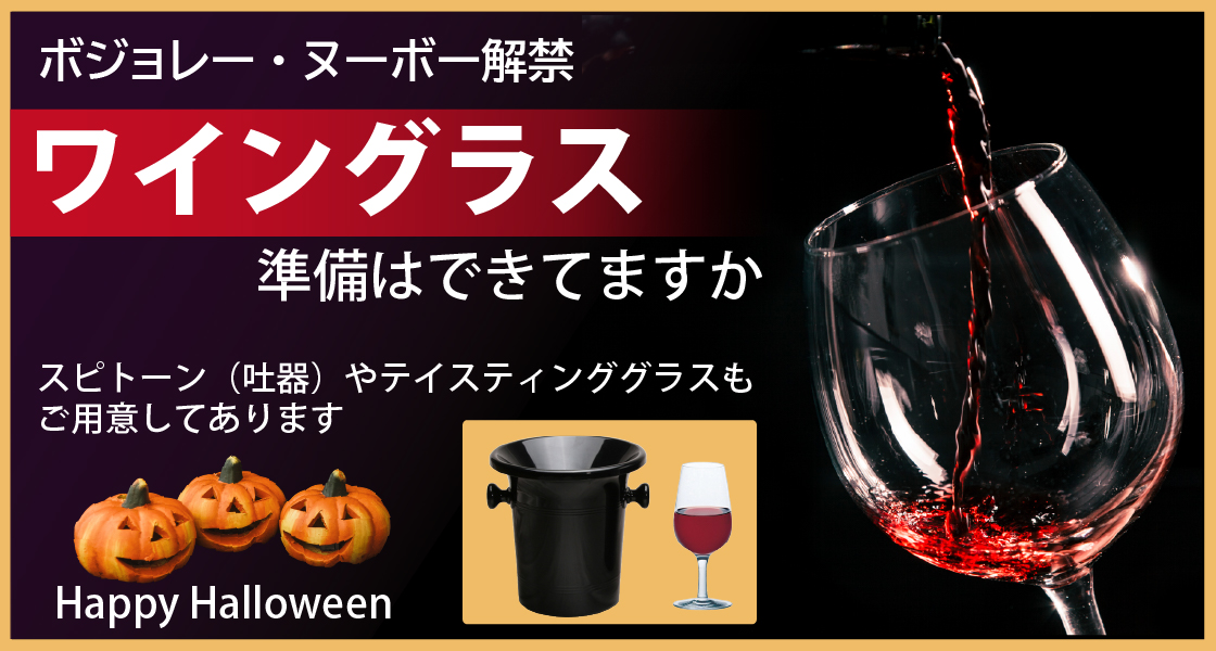 ボジョレー・ヌーヴォーやハローウィンのパーティーに欠かせないワイングラス。ファースト・メイトでは、イベントの規模やシーンによるグラスの種類を多数取り揃えています。